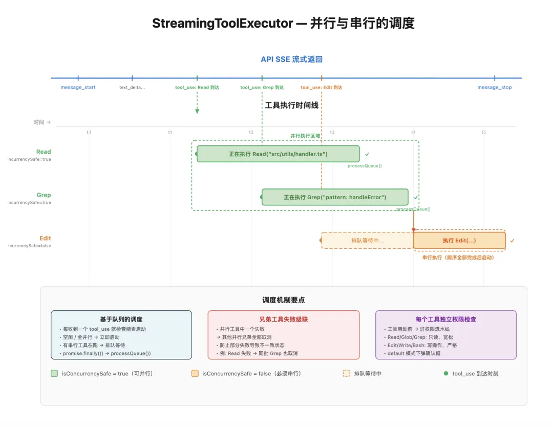 流式工具执行。 不等所有 tool_use 到齐再执行,而是边接收边执行。能并行的并行,必须串行的排队。在模型一次请求多个工具的场景下(这在