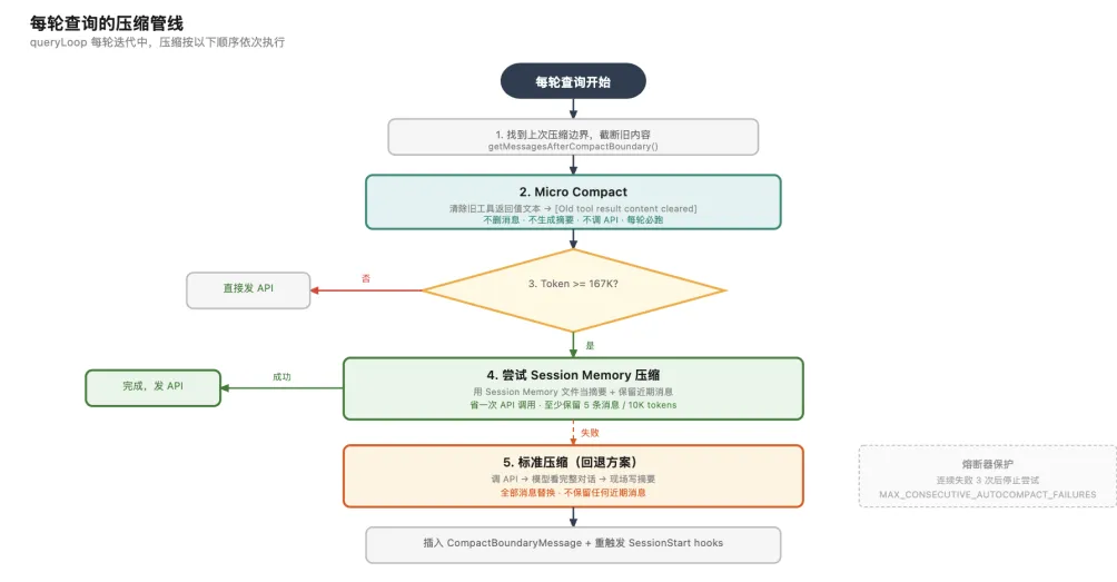 Micro 压缩是最轻量的。每轮查询前都会跑一次,不生成摘要,不调 API,也不删任何消息。