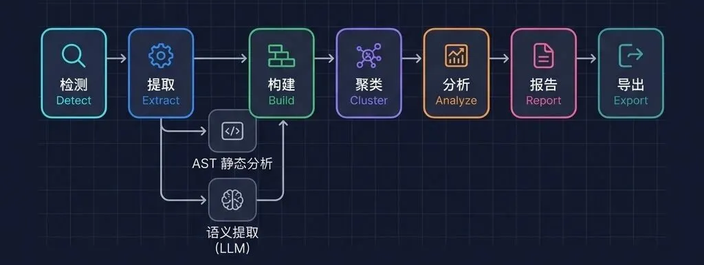 Graphify 七级流水线:检测→提取→构建→聚类→分析→报告→导出