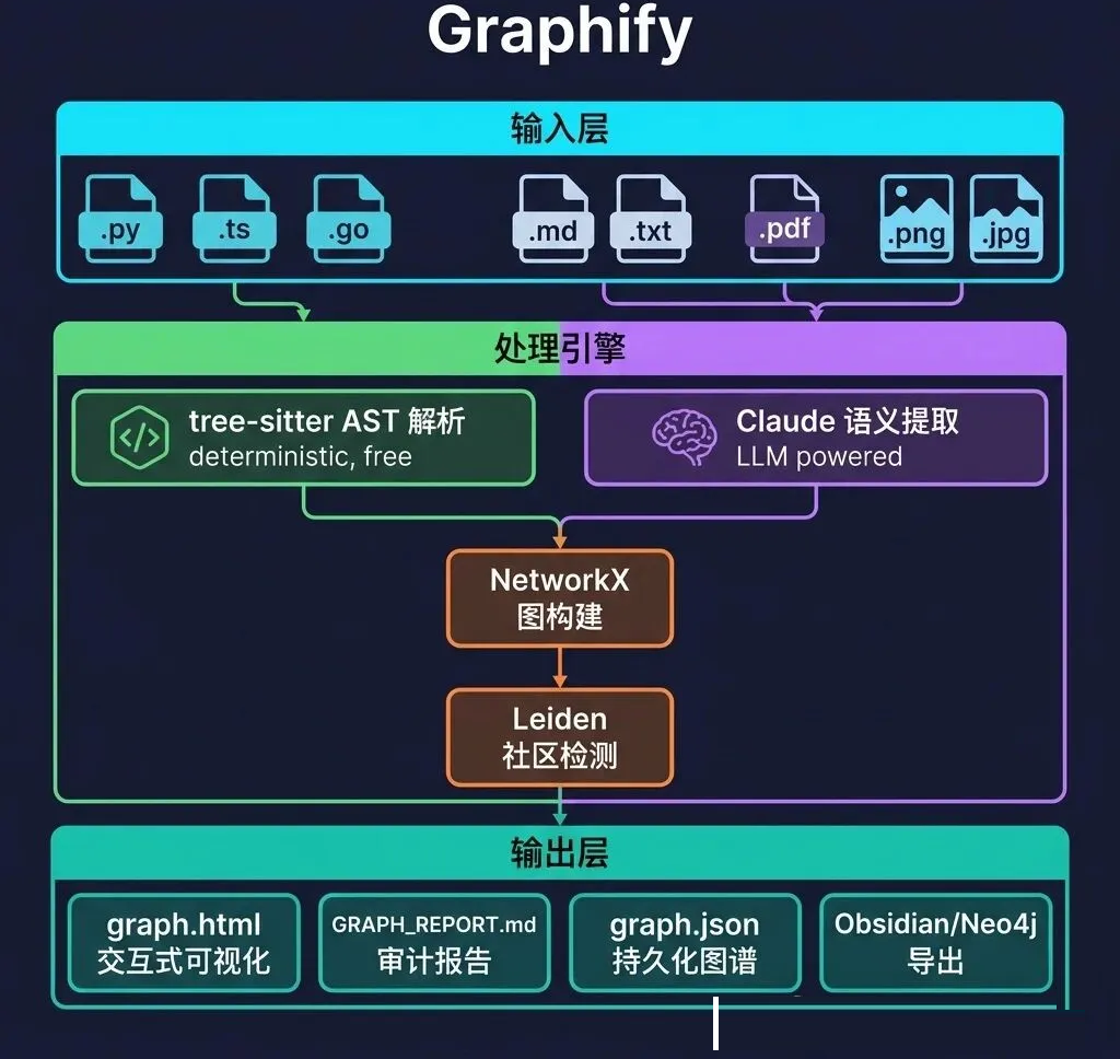 Graphify 系统架构:输入层→处理引擎→输出层