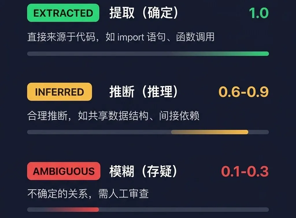 Graphify 的「诚实」设计哲学——不是给你一个黑盒答案,而是通过三级置信度标签让你看到知识的可追溯性。在