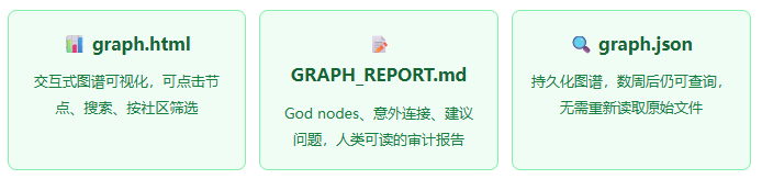 Graphify将任意文件夹(代码、文档、论文、图片)转换为可查询的知识图谱,输出三种格式: