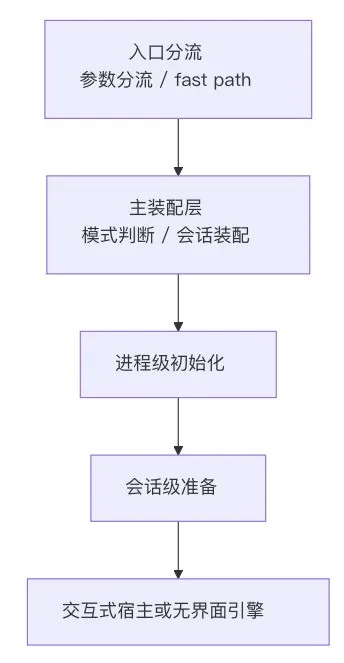 它没有把启动做成“一个大 main 把所有东西拉起来”,而是显式拆成三段:入口分流、进程初始化、会话准备。这个顺序看起来普通,真正厉害的地方在于它把几个本来最容易搅在一起的问题拆开了:启动模式是什么、运行环境是否就绪、当前会话制度是什么、最后由谁承载会话。