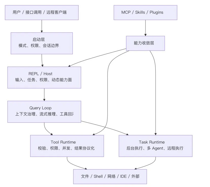 第一条是控制链。它负责回答“这一轮到底在什么制度下运行”。启动层先定边界,REPL 汇总能力面和会话状态,Query