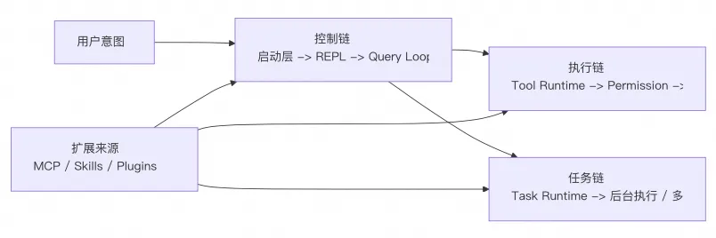 + 一条受约束执行链 + 一套长期任务系统”。这和很多常见 Agent 实现差别很大。后者往往只有一个主循环,所有问题都往里面塞:权限塞进去、后台任务塞进去、扩展接入塞进去、失败恢复也塞进去。短期看实现快,长期看主循环会慢慢长成一团不可维护的运行泥球。