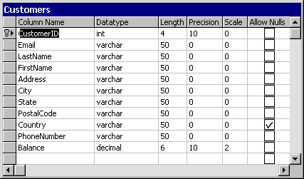 Customers table that includes the properties of each column.