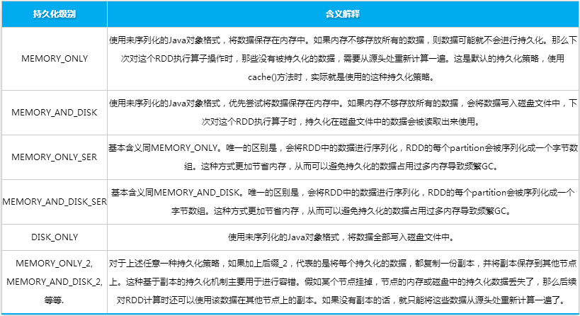 MEMORY_ONLY_2, MEMORY_AND_DISK_2, 等等. 对于上述任意一种持久化策略,如果加上后缀_2,代表的是将每个持久化的数据,都复制一份副本,并将副本保存到其他节点上。这种基于副本的持久化机制主要用于进行容错。假如某个节点挂掉,节点的内存或磁盘中的持久化数据丢失了,那么后续对RDD计算时还可以使用该数据在其他节点上的副本。如果没有副本的话,就只能将这些数据从源头处重新计算一遍了。