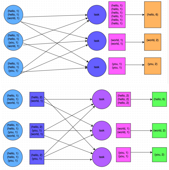 所谓的map-side预聚合,说的是在每个节点本地对相同的key进行一次聚合操作,类似于MapReduce中的本地combiner。map-side预聚合之后,每个节点本地就只会有一条相同的key,因为多条相同的key都被聚合起来了。其他节点在拉取所有节点上的相同key时,就会大大减少需要拉取的数据数量,从而也就减少了磁盘IO以及网络传输开销。通常来说,在可能的情况下,建议使用reduceByKey或者aggregateByKey算子来替代掉groupByKey算子。因为reduceByKey和aggregateByKey算子都会使用用户自定义的函数对每个节点本地的相同key进行预聚合。而groupByKey算子是不会进行预聚合的,全量的数据会在集群的各个节点之间分发和传输,性能相对来说比较差。