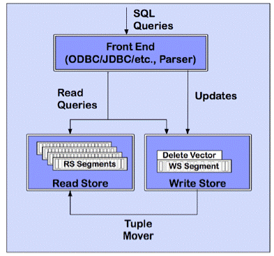 Vertica是OLAP专业的数据库,它通过列方法在磁盘上存储数据。不共享方式的MPP结构包含一个最佳化写入的存储,写入更快,在压缩的形式下读入存储,并且管理双侧数据流元组移动。下面的图3帮助理解Vertica结构: