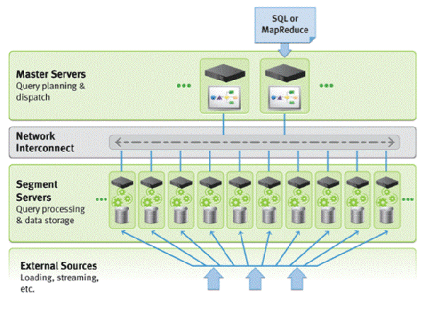 Greenplum是一个非共享MPP结构的数据库,基于PostgreSQL产生。保存的数据可以选择行或列方式。数据存储在服务器段,并且由日志传输的方式测试段单位复制使得其可用。