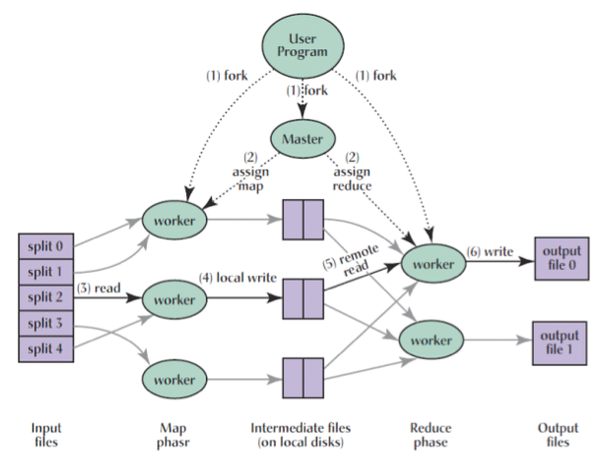 下图展示了map-reduce方法的实现流程。存储在HDFS的数据被分给一个可行的工作者和一个表达值类型,并将结果存放在本来磁盘。数据服从减少过程,并生成一个结果文件。
