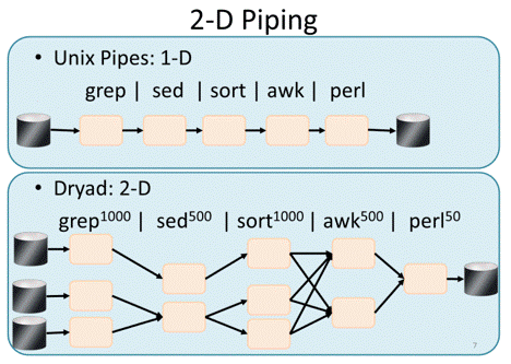框架的就可以直接写Map和Reduce函数,而如果用Dryad,他们需要做图来处理相应的数据。如下图7描述了数据处理在Dryad和UNIX’s