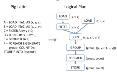 一个通过Pig Latin指明的数据处理程序,转换成逻辑执行计划,接着再转换成Map-Reduce 执行计划。下图显示Pig运算过程。