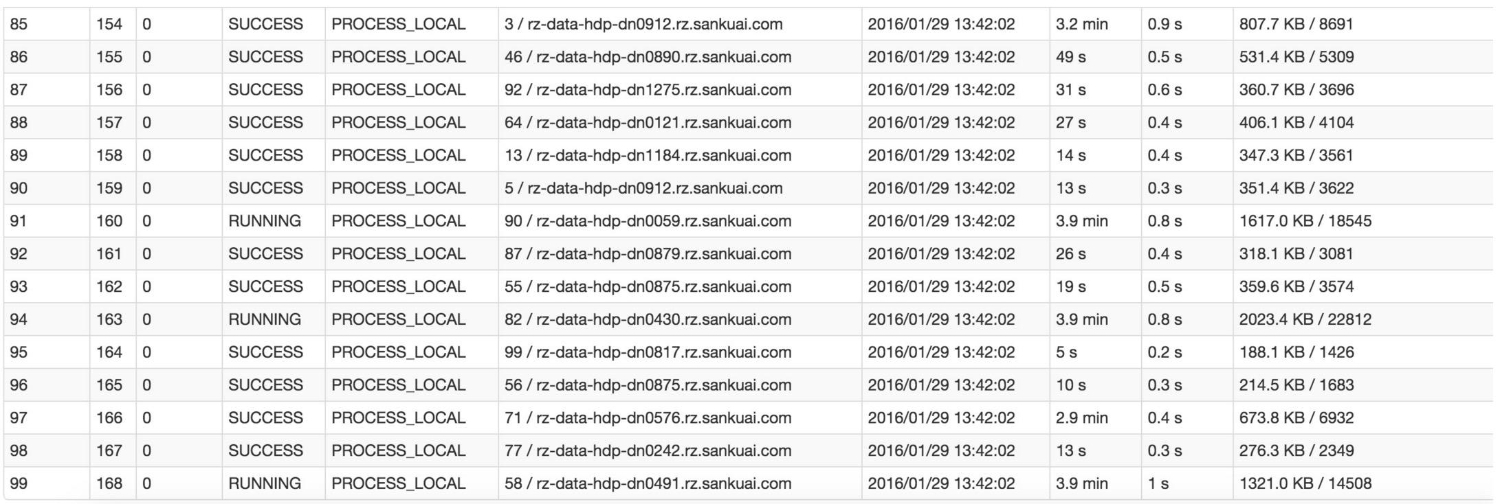 比如下图中,倒数第三列显示了每个task的运行时间。明显可以看到,有的task运行特别快,只需要几秒钟就可以运行完;而有的task运行特别慢,需要几分钟才能运行完,此时单从运行时间上看就已经能够确定发生数据倾斜了。此外,倒数第一列显示了每个task处理的数据量,明显可以看到,运行时间特别短的task只需要处理几百KB的数据即可,而运行时间特别长的task需要处理几千KB的数据,处理的数据量差了10倍。此时更加能够确定是发生了数据倾斜。