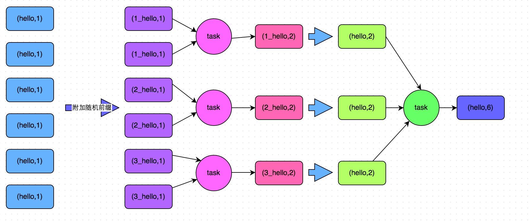 2) (2_hello, 2)。然后将各个key的前缀给去掉,就会变成(hello,2)(hello,2),再次进行全局聚合操作,就可以得到最终结果了,比如(hello,
