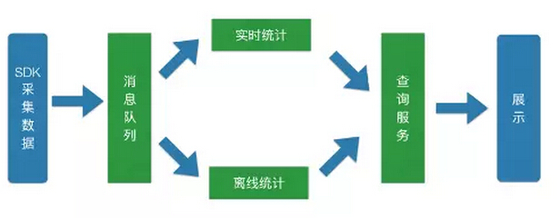 先看一下我们数据处理的主要步骤,首先是我们SDK采集数据,采集数据之后,首先把它扔到我们的消息队列里做一个基础的持久化,之后我们会有两部分,一部分是实时统计,一部分是离线统计,这两部分统计完之后会把统计结果存下来,然后提供给我们的查询服务,最后是我们外部展示界面。我们的数据平台主要基于中间的四个绿色的部分。