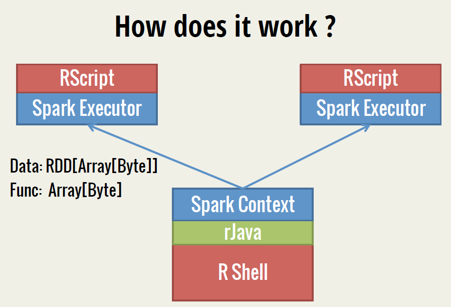 shell交互性的运行job。SparkR集合了Spark 和R的优势,下面的这3幅图很好的阐释了SparkR的运行机制。