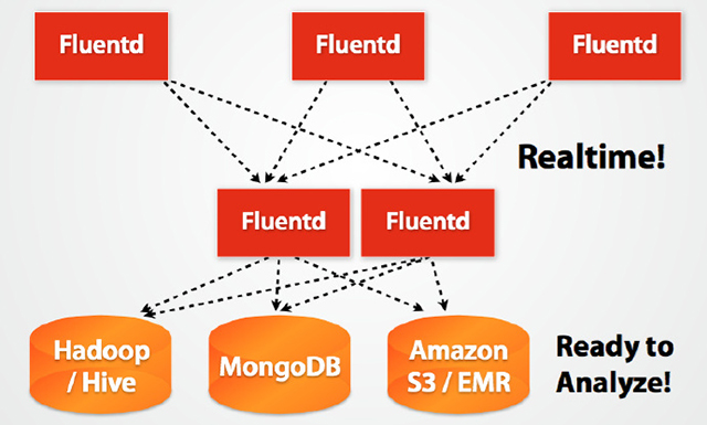 Fluentd (Github 地址)是另一个开源的数据收集框架。Fluentd使用C/Ruby开发,使用JSON文件来统一日志数据。它的可插拔架构,支持各种不同种类和格式的数据源和数据输出。最后它也同时提供了高可靠和很好的扩展性。Treasure