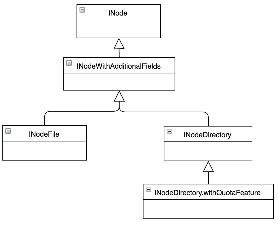下图5为Namespace中INode的类图结构,从类图可以看出,文件INodeFile和目录INodeDirectory的继承关系。其中目录在内存中由INodeDirectory对象来表示,并用List