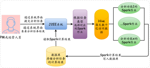 由于系统需要满足不同类别的用户行为分析功能(目前系统中已经提供了十个以上分析功能),因此需要为每一种分析功能都开发一个Spark作业。