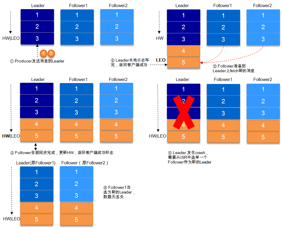 下图详细的说明了当producer生产消息至broker后,ISR以及HW和LEO的流转过程: