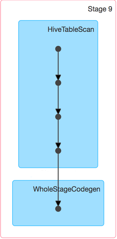 通过如下DAG图可见,该操作仍分为三个Stage,且仍然有Shuffle存在,唯一不同的是,小表的读取不再直接扫描Hive表,而是扫描内存中缓存的表。