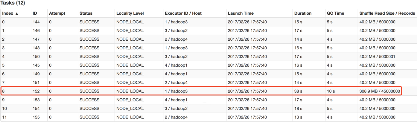 GroupBy Stage的Task状态如下图所示,Task 8处理的记录数为4500万,远大于(9倍于)其它11个Task处理的500万记录。而Task 8所耗费的时间为38秒,远高于其它11个Task的平均时间(16秒)。整个Stage的时间也为38秒,该时间主要由最慢的Task 8决定。