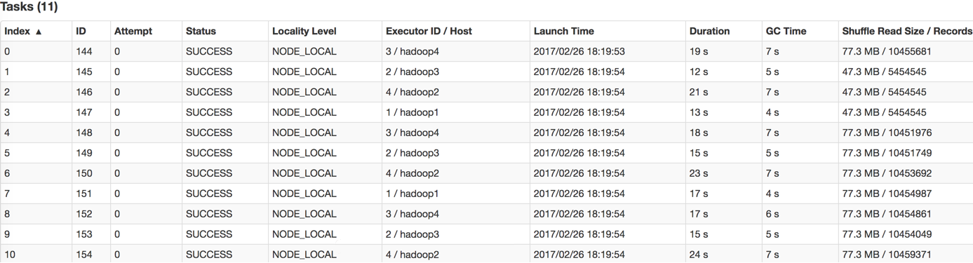 从上图可见,处理记录数最多的Task 6所处理的记录数约为1045万,耗时为23秒。处理记录数最少的Task 1处理的记录数约为545万,耗时12秒。