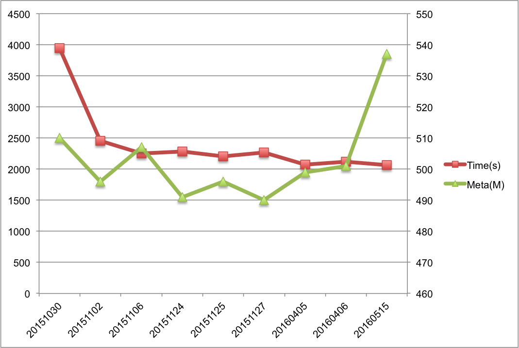 经过多次优化调整,从线上NameNode历次的重启时间监控指标上看,收益非常明显,图7截取了其中几次NameNode重启时元数据量及重启时间开销对比,图中直观显示在500M元数据量级下,重启时间从~4000s优化到~2000s。
