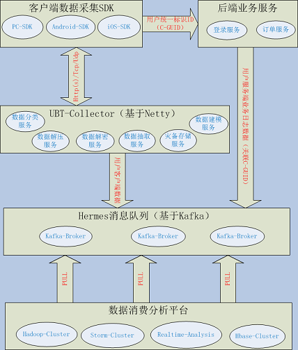 其中整个平台系统主要包括以上五部分:客户端数据采集SDK以Http(s)/Tcp/Udp协议根据不同的网络环境按一定策略将数据发送到Mechanic(UBT-Collector)服务器。服务器对采集的数据进行一系列处理之后将数据异步写入Hermes(Kafka)分布式消息队列系统。为了关联业务服务端用户业务操作埋点、日志,业务服务器需要获取由客户端SDK统一生成的用户标识(C-GUID),然后业务服务器将用户业务操作埋点、日志信息以异步方式写入Hermes(Kafka)队列。最后数据消费分析平台,都从Hermes(Kafka)中消费采集数据,进行数据实时或者离线分析。其中Mechanic(UBT-Collector)系统还包括对采集数据和自身系统的监控,这些监控信息先写入Hbase集群,然后通过Dashboard界面进行实时监控。