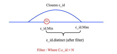 柱状图横坐标表示列值大小分布,纵坐标表示频率。假设N在如图所示位置,那过滤后总行数c_id.distinct(after