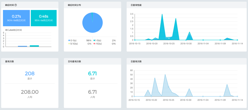 查询是Apache Kylin的强项,但也存在种种因素导致某些查询变慢。查询性能一般通过整体的性能、并发统计数据来体现,KyBot的查询仪表盘可以直观展现不同维度的查询统计信息。如下图所示,这里可以看到查询响应时间的90百分位和95百分位、不同响应时间分布、每日性能变化等,用于直观把握查询性能的整体表现;下方的查询次数、人均查询次数、每日查询次数等直观展现Apache