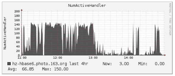 于是就继续查看其他监控信息,首先确认系统资源(主要是IO)并没有到达瓶颈,其次确认了写入的均衡性,直至看到下图,才追踪到影响其他业务写入的第二个关键点:RegionServer的handler(配置150)被残暴耗尽: