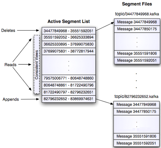 value”,4个字节的CRC校验码,其后跟N个字节的消息体。每条消息都有一个当前Partition下唯一的64字节的offset,它指明了这条消息的起始位置。磁盘上存储的消息格式如下: message length : 4 bytes (value: 1+4+n) “magic” value : 1 byte crc : 4 bytes payload : n bytes 这个log entry并非由一个文件构成,而是分成多个segment,每个segment以该segment第一条消息的offset命名并以“.kafka”为后缀。另外会有一个索引文件,它标明了每个segment下包含的log