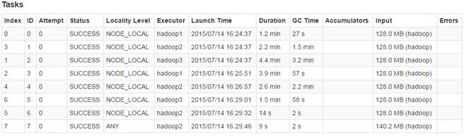 通过页面监控可以看到该作业分为8个任务,其中一个任务的数据来源于两个数据分片,其他的任务各对应一个数据分片,即显示7个任务获取数据的类型为(NODE_LOCAL),1个任务获取数据的类型为任何位置(ANY)。