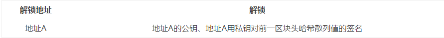 地址A 地址A的公钥、地址A用私钥对前一区块头哈希散列值的签名
