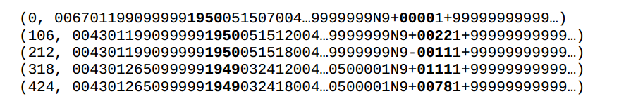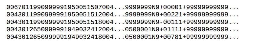 例如从大量历史数据中找出往年最高气温,NCDC公开了过去每一年的所有气温等天气数据的检测,每一行记录一条观测记录,格式如下: