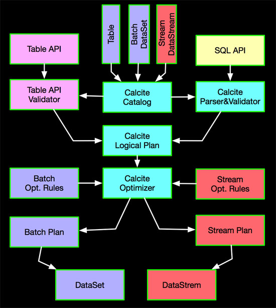 TableAPI&SQL最终会经过Calcite优化之后转换为DataStream和DataSet,具体转换示意如下: