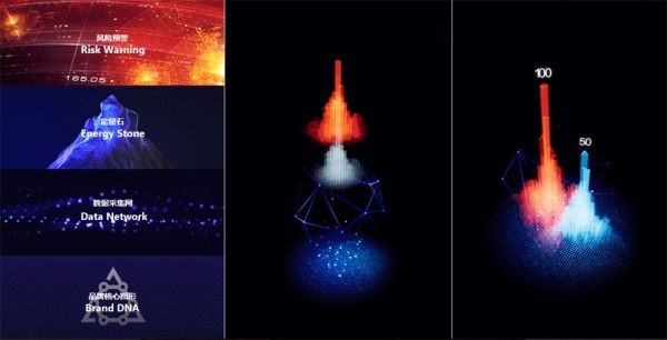 灵鲲的3D数据样式有柱状图和散点图。如何把司空见惯的数据样式,设计出产品的个性,是我们重点要解决的问题。为了体现大数据的力量感,使用科幻电影中的聚合能量、发光的能量石作为柱状图的主图形;同时把数据采集、融合、分析的过程具象为动态粒子网络,作为辅助图形。数据图形和结构中都融合了品牌