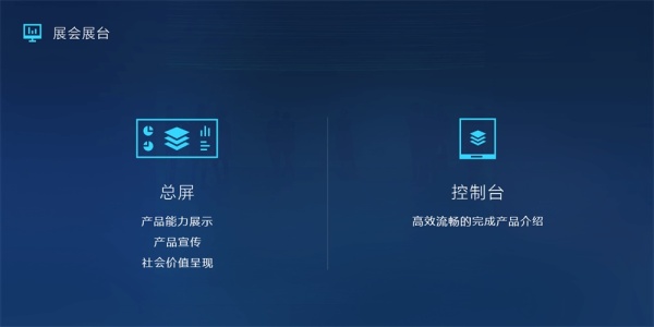 不同于工作场景,灵鲲产品在展会中展台的主要受众是参会人士,除了一般民众外,更有价值的观众主要来自于媒体和潜在客户等。所以在这个场景中展示的内容与实际工作中的数据可视化内容有一定的区别,更多的是对产品能力的展示、产品的宣传以及社会价值的呈现。如何直观的呈现产品的能力,并使观众快速获得有价值的信息并留下深刻印象非常重要。这也决定了在这个场景中,用户不仅包括观众,也包括演讲者。我们需要考虑如何通过控制端让讲演者高效而流畅的完成产品介绍。