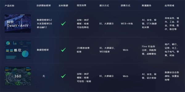 通过对阿里 DataV,AntV、360、帆软的大数据可视化产品的体验,我们从产品呈现、产品体验、产品技术、部署方式和商业模式几个维度的横向对比。阿里的技术对可视化效果的局限性很大,优点是产品实现模板化、系统实时可交互,用户可以快速搭建自己的可视化产品;360产品可视化呈现3D化,数据呈现效果和数据感知度较2D更优,但是系统非实时可交互,而且搭建周期长,成本较高;帆软的可视化是传统报表型,可视化效果呈现缺乏竞争力。