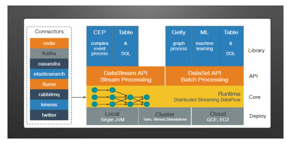 API)和面向批处理的接口(DataSet API),同时flink支持拓展库设计机器学习,FlinkML,复杂时间处理(CEP)以及图计算,还有分别针对流处理和批处理的Table