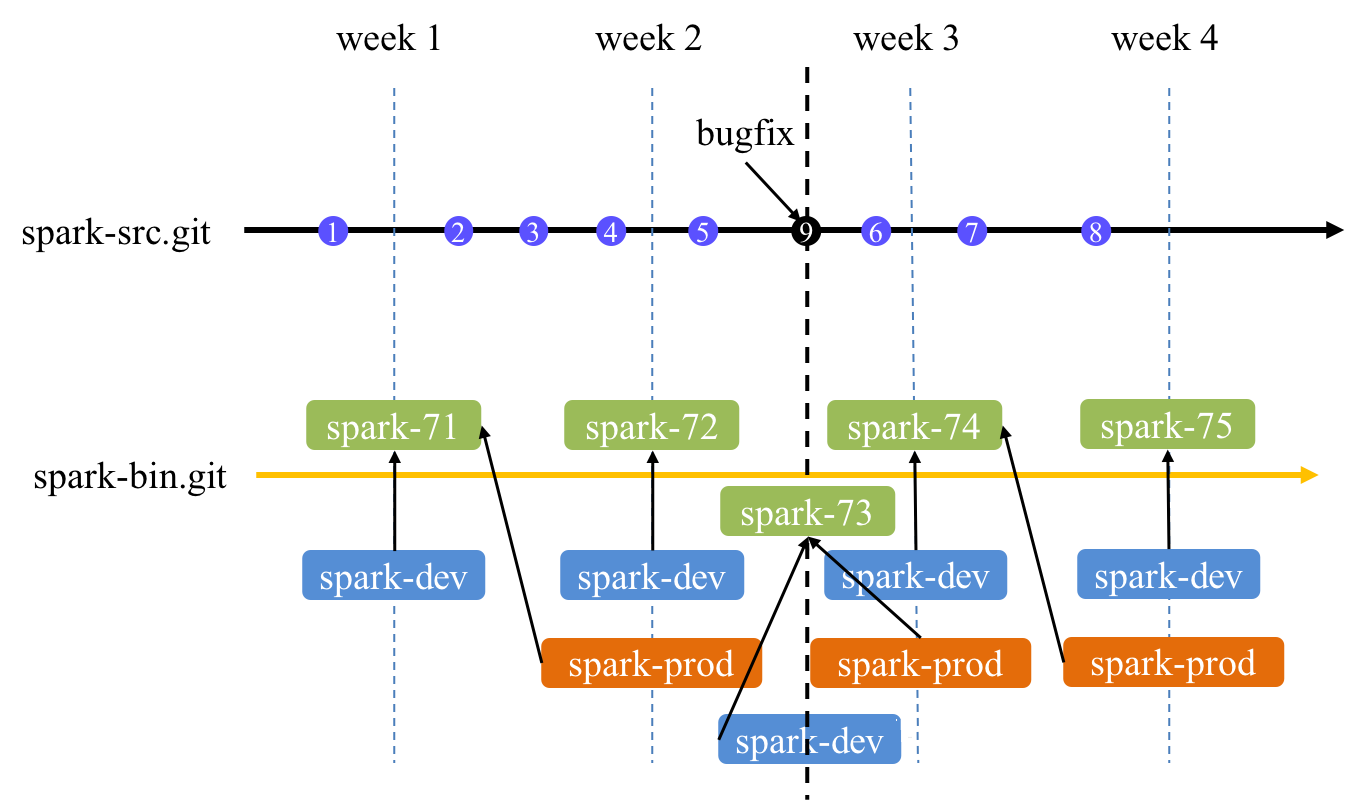 如下图中,第 2 周与第 3 周之间在 Staging 环境中发现 dev 版本的 bug,在 spark-src.git/dev(包含