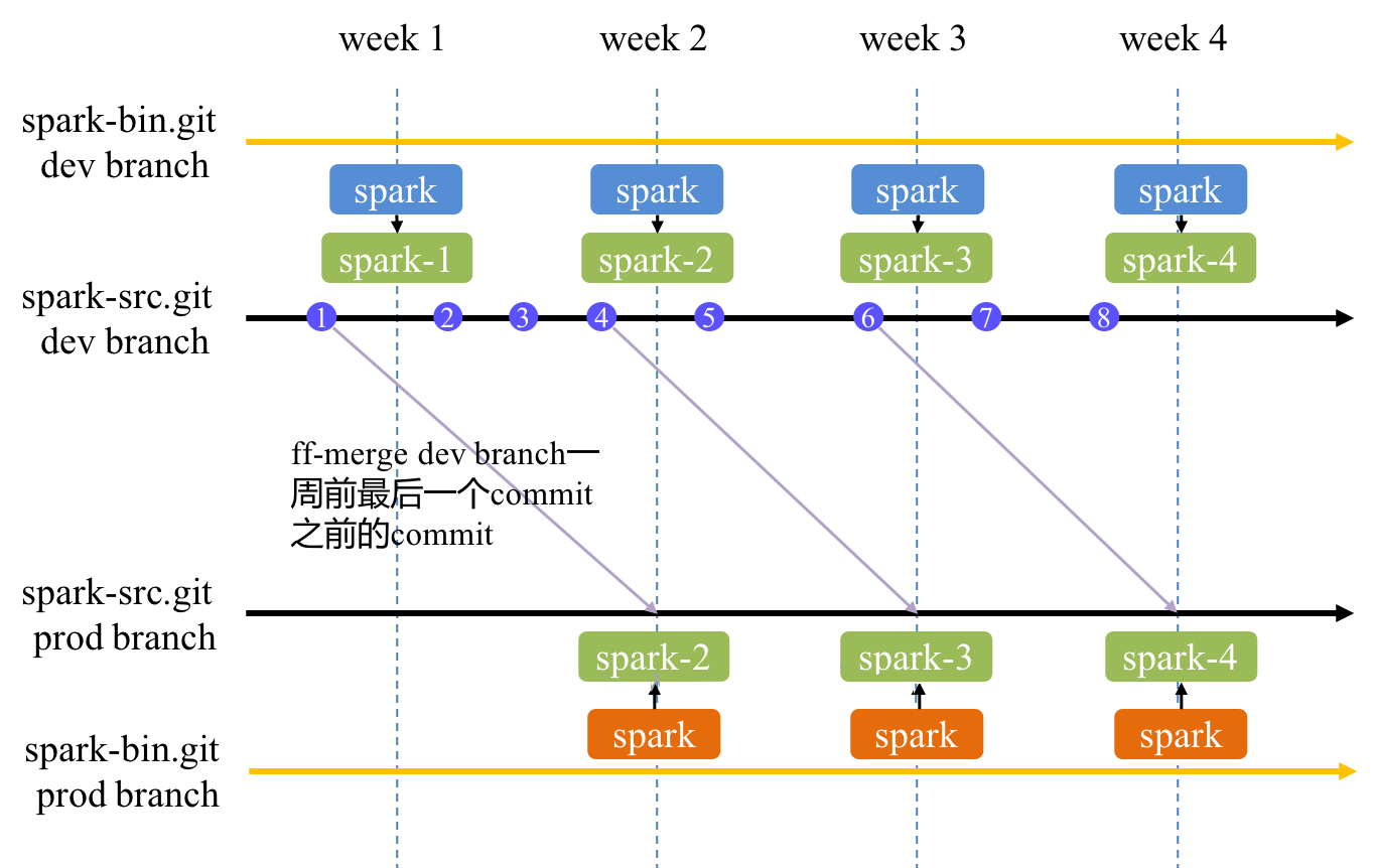 spark-prod 落后于 spark-dev 一周(一个 release),意味着 spark-prod