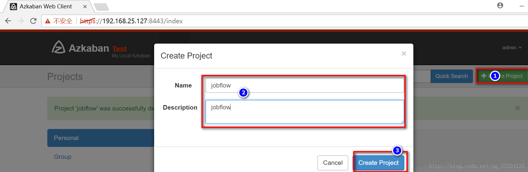 3)、在azkaban的web管理界面创建工程并上传zip包