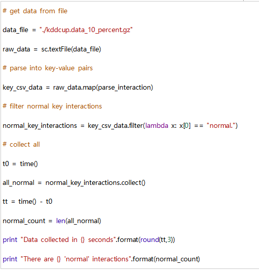 假设我们要计算我们在数据集中有多少正常的相互作用。,可以按如下过滤我们的raw_data RDD。