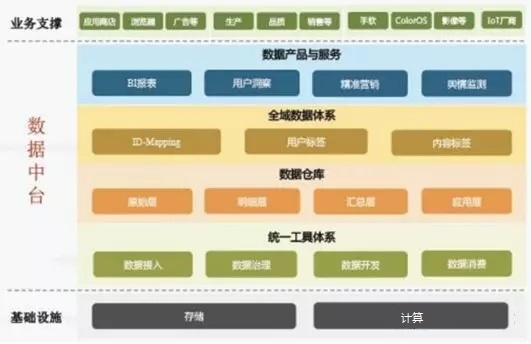 OPPO将数据中台分为4个层次,其中最下层是统一工具体系,涵盖了“接入—治理—开发—消费”全数据链路;基于工具体系之上构建了数据仓库,划分成“原始层—明细层—汇总层—应用层”,这也是经典的数仓架构;再往上是全域的数据体系,什么是全域呢?就是把公司所有的业务数据都打通,形成统一的数据资产,比如