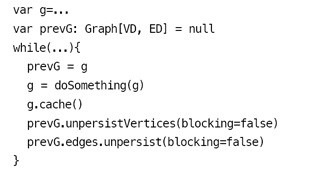 大体之意是根据GraphX中Graph的不变性,对g做操作并赋回给g之后,g已不是原来的g了,而且会在下一轮迭代使用,所以必须cache。另外,必须先用prevG保留住对原来图的引用,并在新图产生后,快速将旧图彻底释放掉。否则,十几轮迭代后,会有内存泄漏问题,很快耗光作业缓存空间。