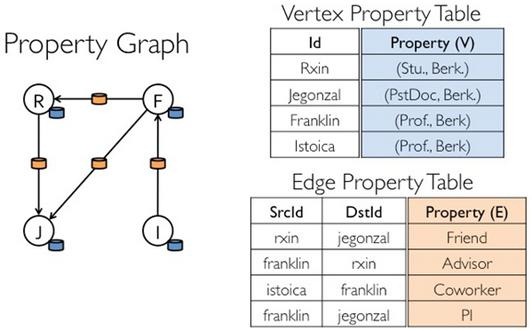 Property Graph,一种点和边都带属性的有向多重图。它扩展了Spark RDD的抽象,有Table和Graph两种视图,而只需要一份物理存储。两种视图都有自己独有的操作符,从而获得了灵活操作和执行效率。