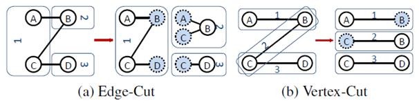 l边分割(Edge-Cut):每个顶点都存储一次,但有的边会被打断分到两台机器上。这样做的好处是节省存储空间;坏处是对图进行基于边的计算时,对于一条两个顶点被分到不同机器上的边来说,要跨机器通信传输数据,内网通信流量大。